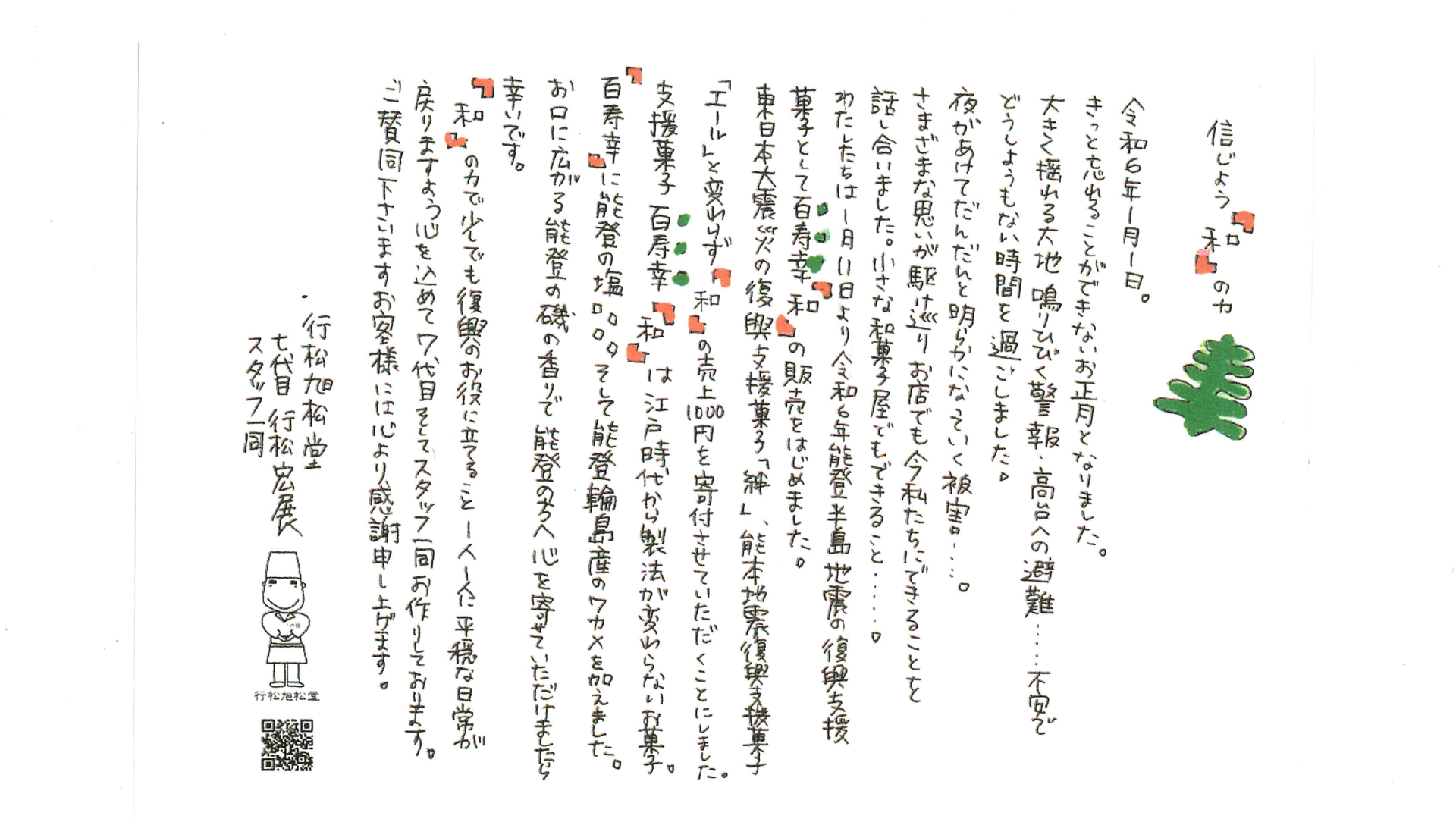 やまとグループでは、能登の復興支援の一環として、小松市京町の創業188年の行松旭松堂さんの支援菓子「和(なごみ)」を社員食堂や市内の各事業所の働きさんに提供いたしました。