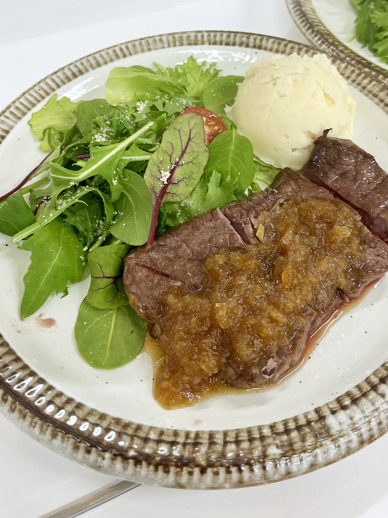 メインのステーキにマッシュポテト、クリスマスカラーのサラダを添えた