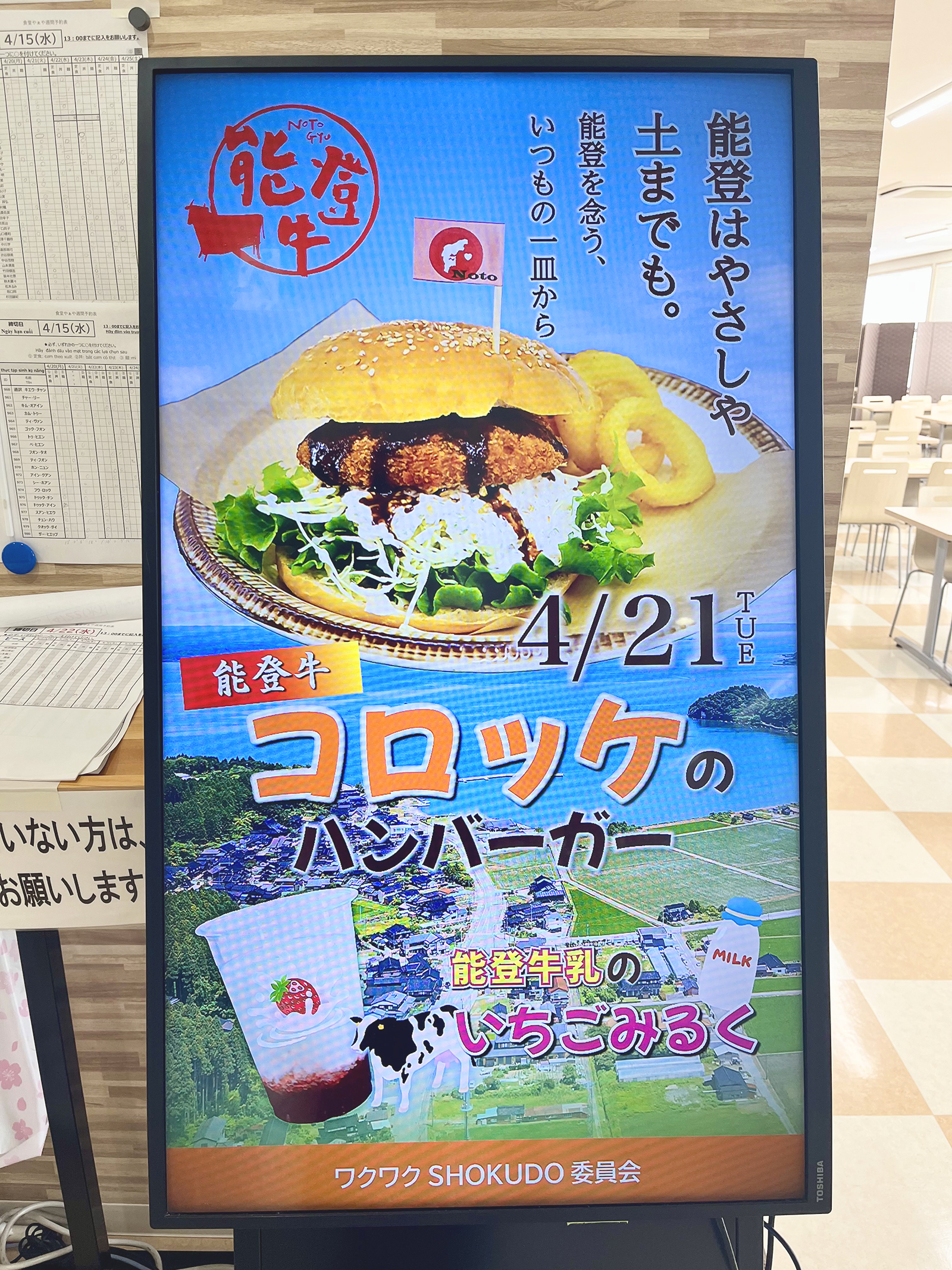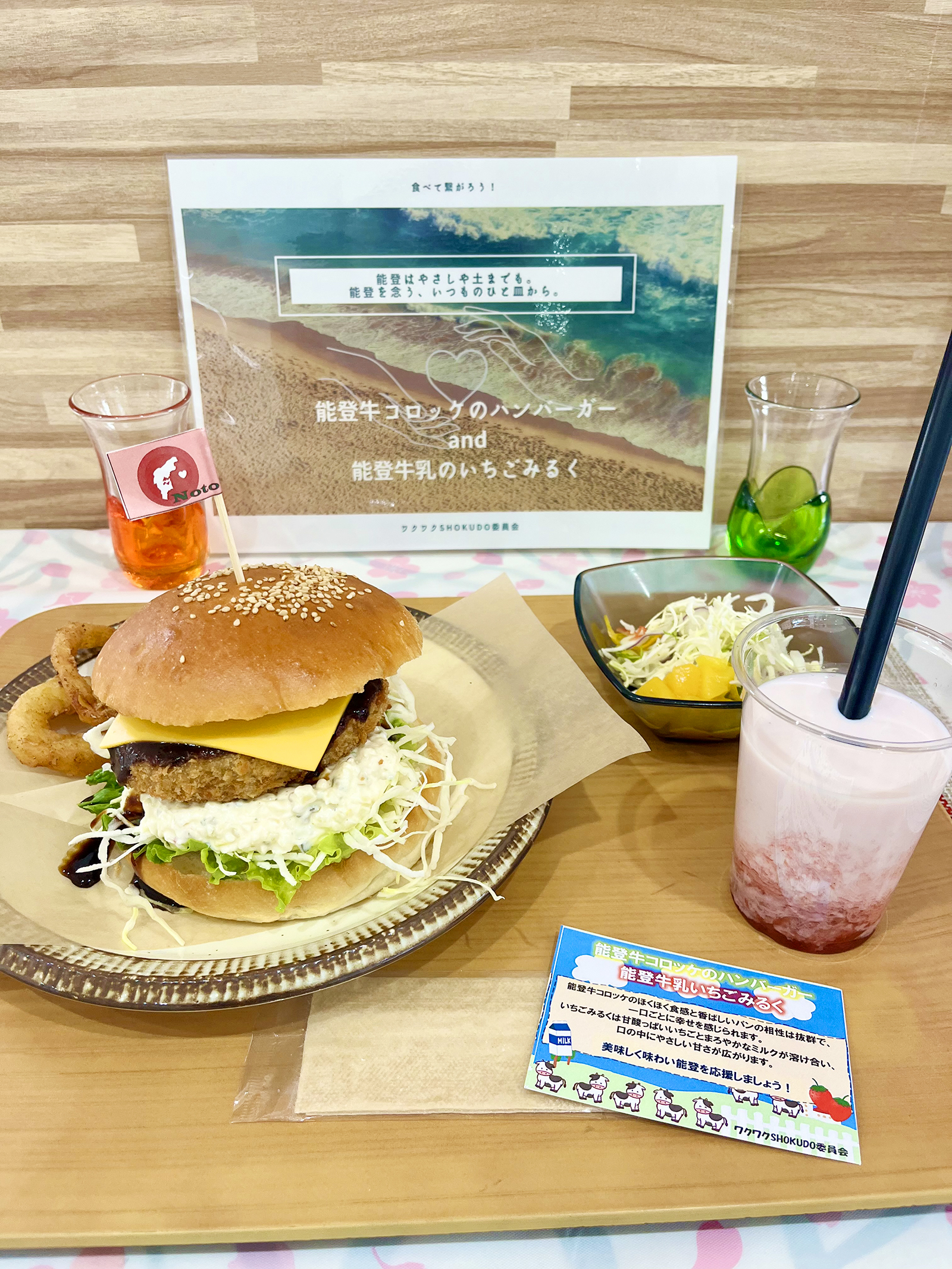 食堂にて能登牛コロッケのハンバーガーと、能登牛乳のいちごみるくを振舞いました。