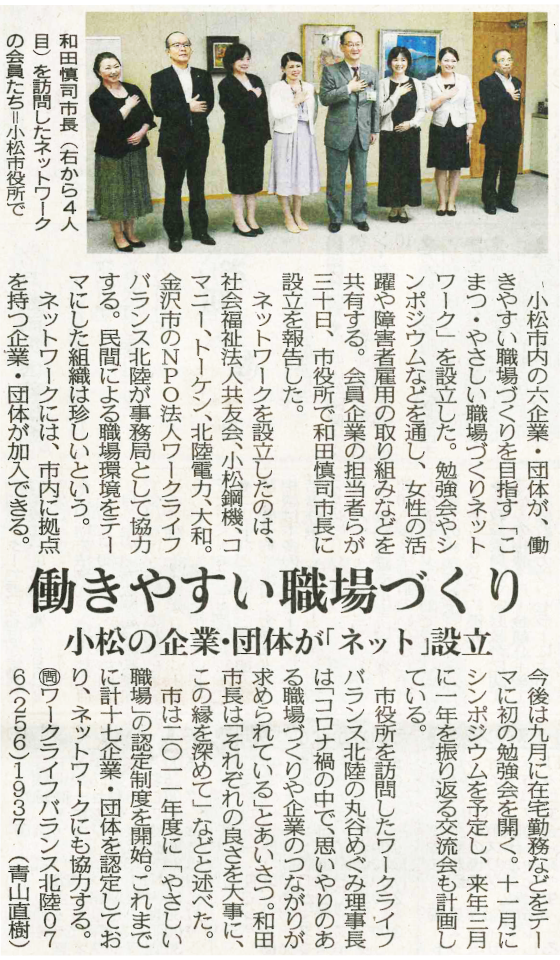 小松市の職場環境向上のため「こまつ・やさしい職場ネットワーク」が設立し、2020年7月30日(木)幹事会社で小松市の和田市長を表敬訪問致しました。
