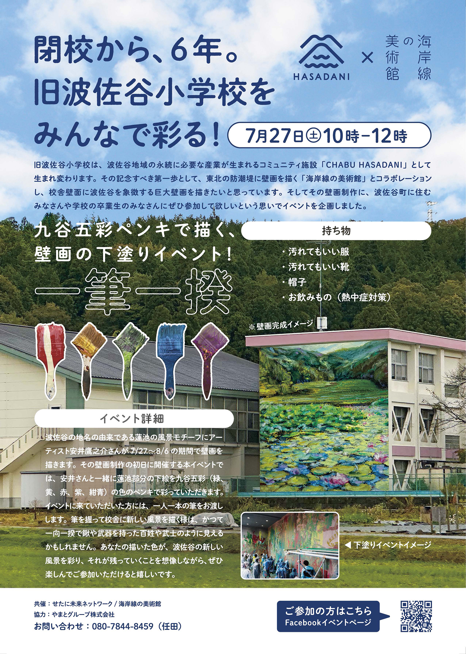 2024年9月から順次開業のため改修工事を行っている旧波佐谷小学校の校舎西側の壁画アートの制作が7月28日から始まりました。