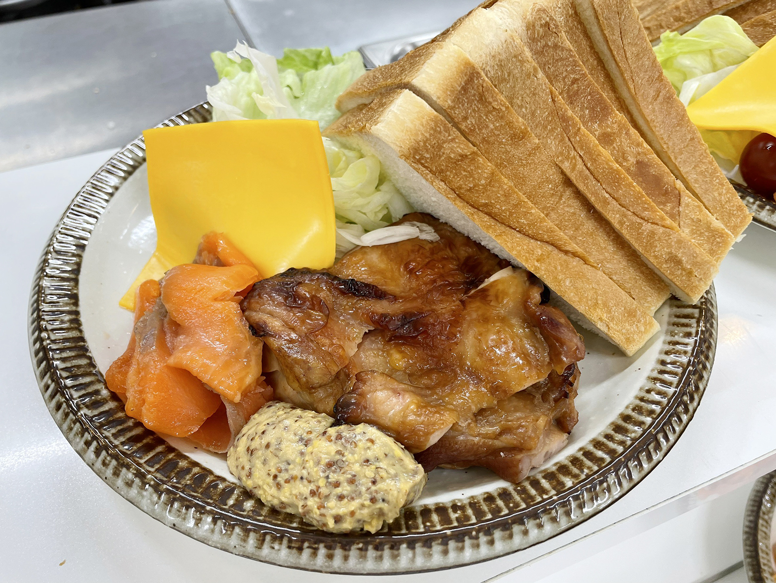 サンドイッチの具は前日からよくタレ漬けされた照り焼きチキン、オイル漬けのスモークサーモン、レタス、たまねぎ、スライスチーズ、トマトの6種類、ソースはタルタルと粒マスタードの2種類です。