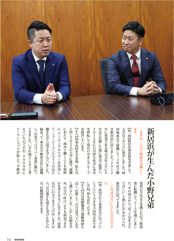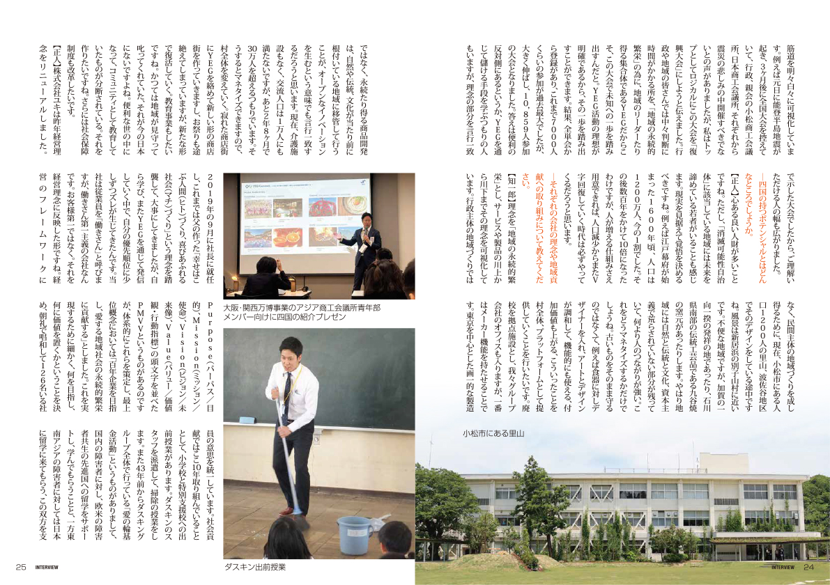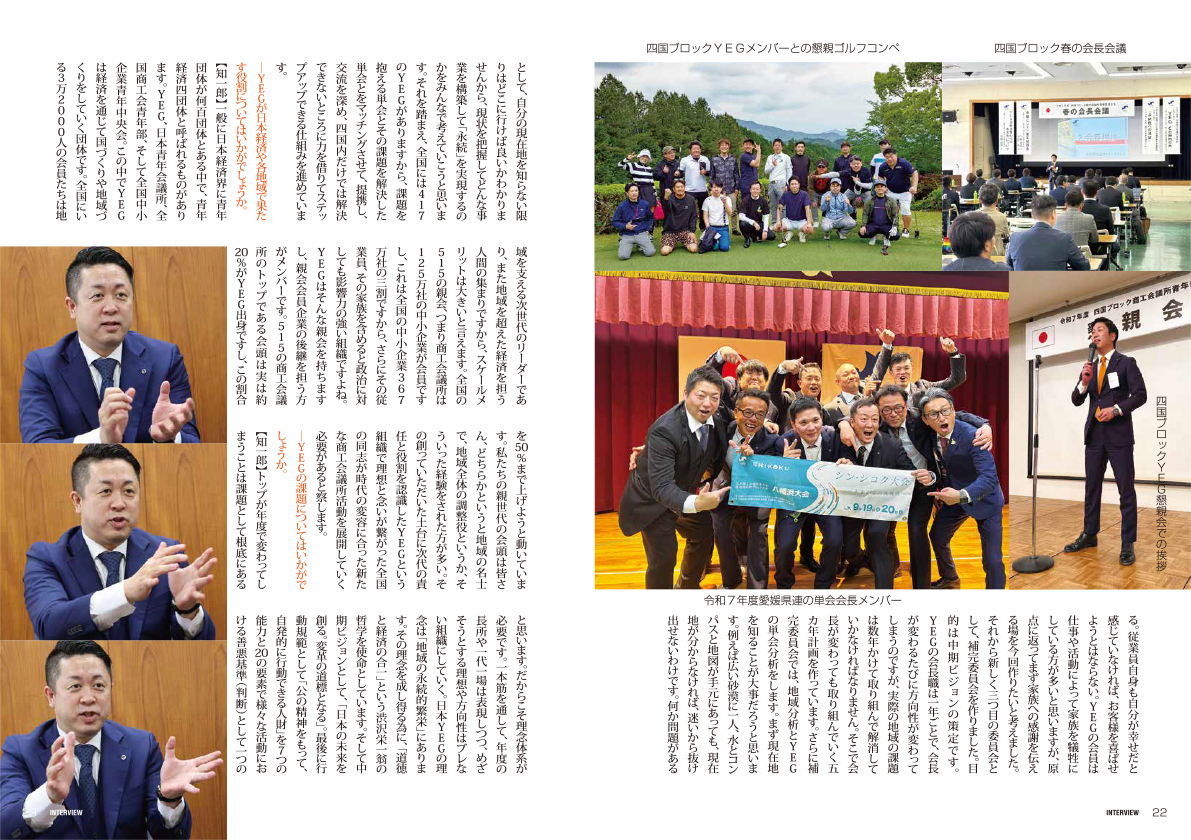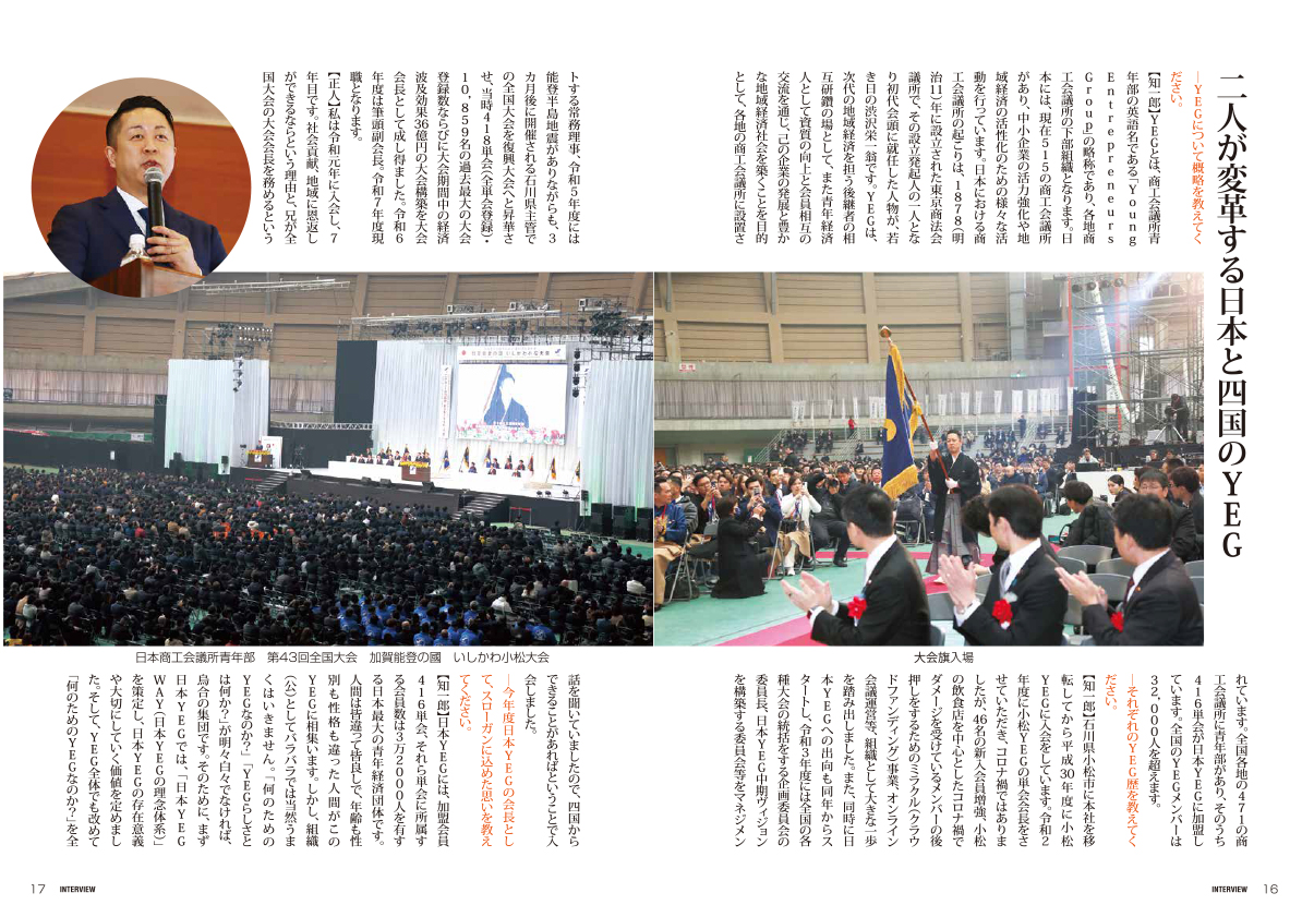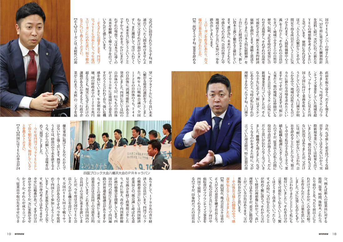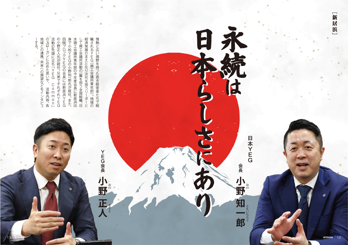 日本YEGの会長を務めさせていただいております弊社代表の小野知一郎が、四国ブロックYEG会長の小野正人さまと共に、愛媛県の経済誌「インタビュー」よりインタビューを受け、地域連携や未来への展望など、それぞれの念(おも)いを語った様子を掲載いただきました。