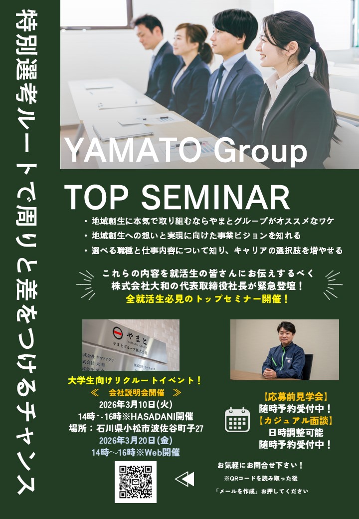 株式会社大和の社長が登壇して、学生の皆さまに向けた講話を行います。質疑応答もあり、会社の経営者と直接お話出来ます。
